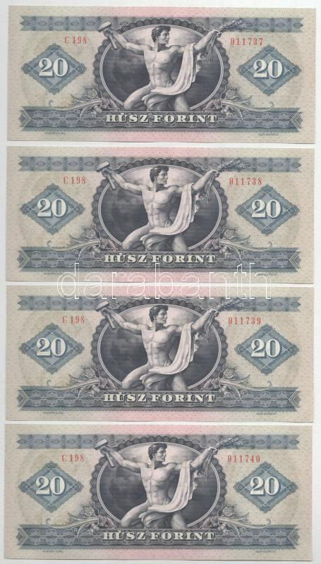 1975. 20Ft (4x) sorszámkövetők "C 198 011737 - C 198 011740"... https://www.darabanth.com/hu/444-Gyorsarveres/444.0/Numizmatika/Magyar-bankjegyek~1000007/1975-20Ft-4x-sorszamkovetok-C-198-011737-C-198-011740-TUNC-AU-Adamo-F16~II2929803