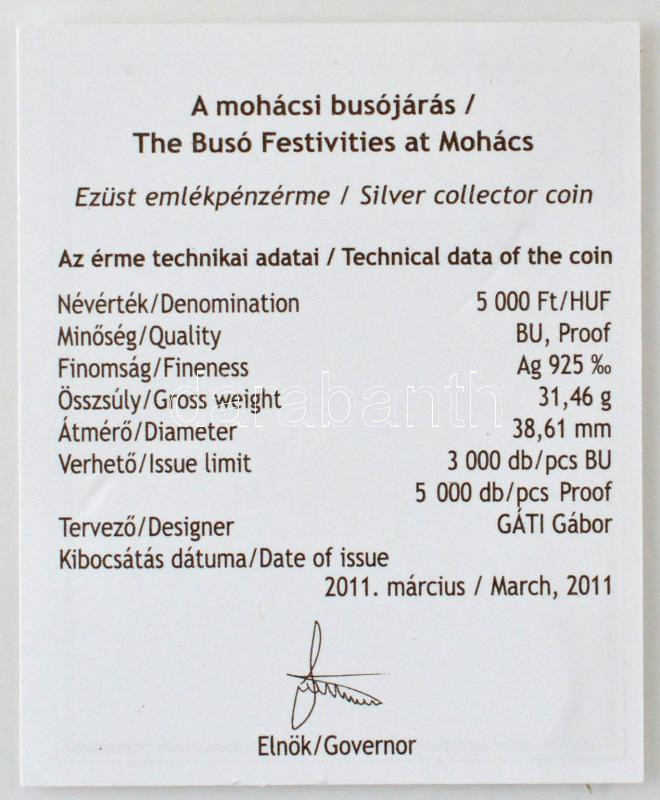 Leírás: 2011. 5000Ft Ag "A mohácsi busójárás" tanúsítvánnyal T:PP Adamo EM237