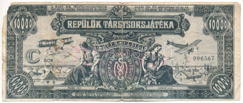 1926. "Magyar Sportrepülők Egyesülete - Repülők Tárgysorsjátéka -... https://www.darabanth.com/hu/444-Gyorsarveres/444.0/Numizmatika/Reszvenyek-es-sorsjegyek~1000005/1926-Magyar-Sportrepulok-Egyesulete-Repulok-Targysorsjateka-Dollar-Sorsjegy-C-soroza~II2933592