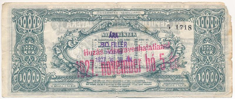Leírás: 1926. "Magyar Sportrepülők Egyesülete - Repülők Tárgysorsjátéka - Dollár Sorsjegy" C-sorozat T:VG anyaghiány