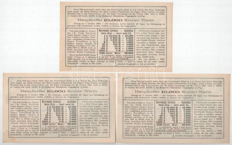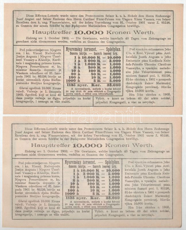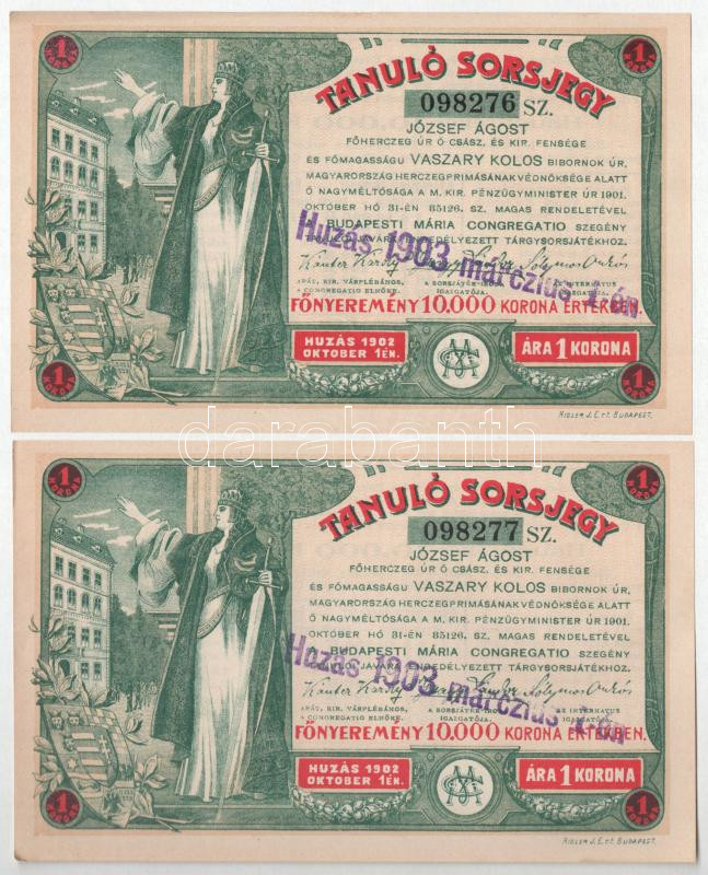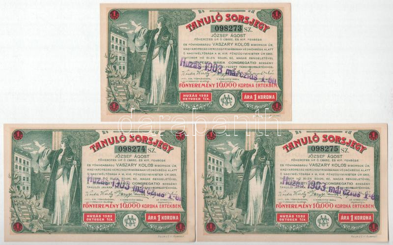 Leírás: Budapest 1903. "Tanuló Sorsjegy" 1K értékben (5x) sorszámkövetők "098273-098277" vízjeles papíron, felülbélyegzéssel T:UNC,AU kis sarokhajlások, folt
