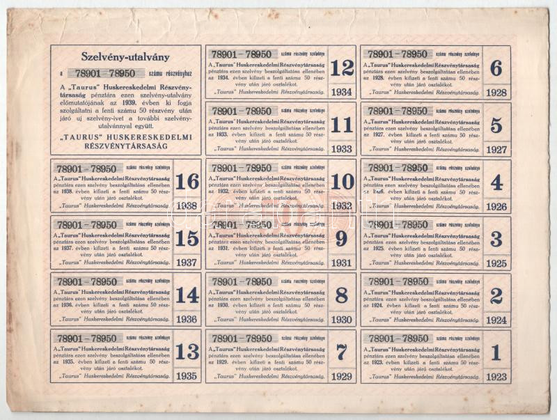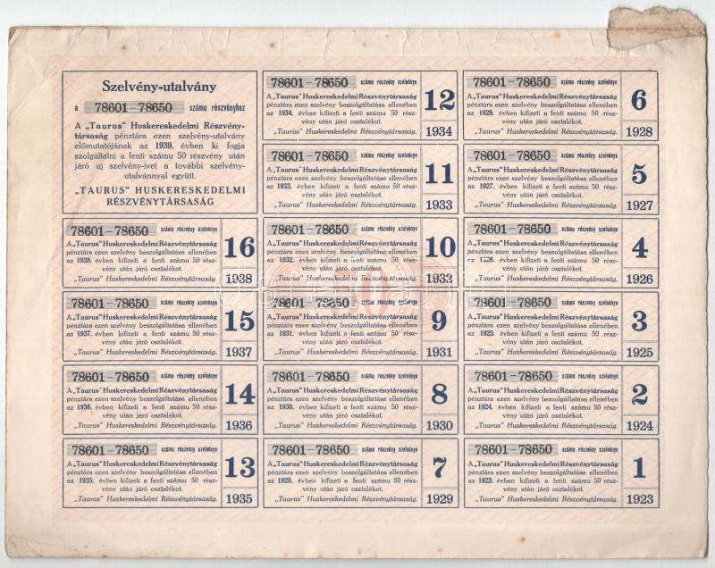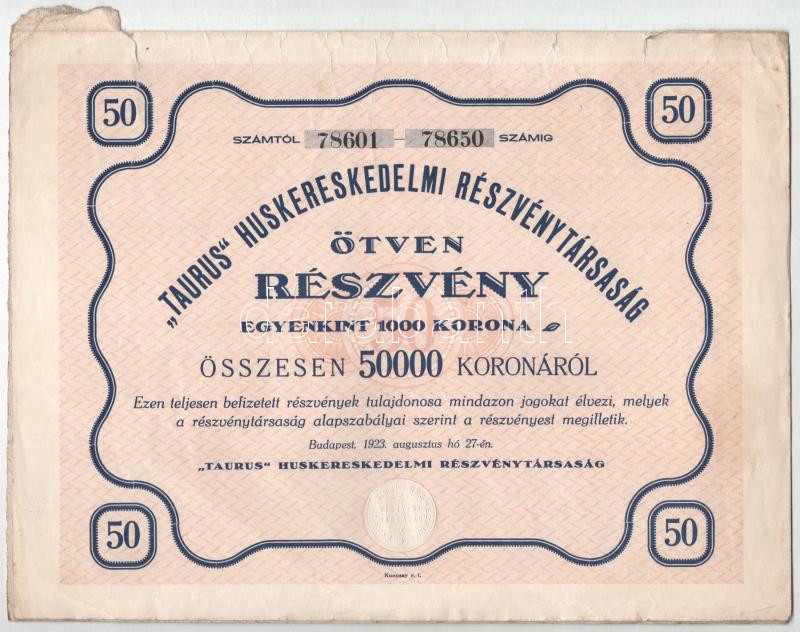 Leírás: Budapest 1923. " 'Taurus' Huskereskedelmi Részvénytársaság" 50 részvénye összesen 50.000K-ról, szelvényekkel és szárazpecséttel (2x) T:VF,F szakdás, fo.