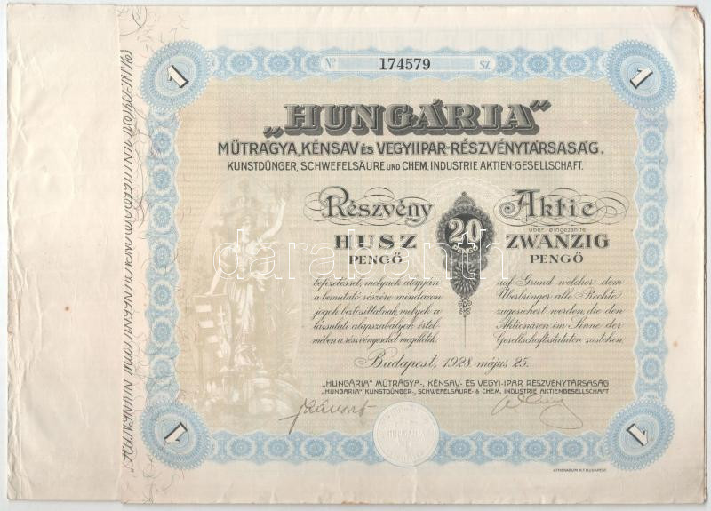 Budapest 1928. " 'Hungária' Műtrágya, Kénsav és Vegyiip... https://www.darabanth.com/hu/444-Gyorsarveres/444.0/Numizmatika/Reszvenyek-es-sorsjegyek~1000005/Budapest-1928-Hungaria-Mutragya-Kensav-es-Vegyiipar-Reszvenytarsasag-reszvenye-20P~II2926494