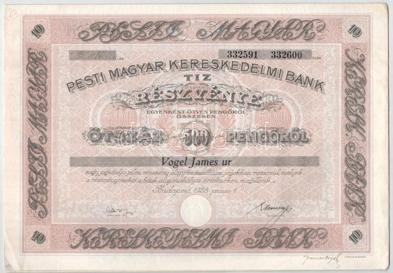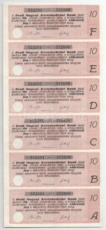 Budapest 1928. "Pesti Magyar Kereskedelmi Bank" tíz részvénye egyben, összesen 500P-ről, névre szóló, szelvényekkel, szárazpecséttel T:AU / Hungary / Budapest 1928. "Hungarian Commercial Bank of Pest" 10 shares in one, all about 500 Pengő, with coupons and embossed stamp C:AU