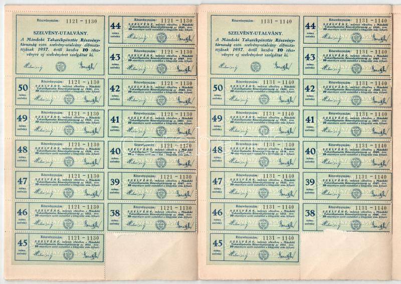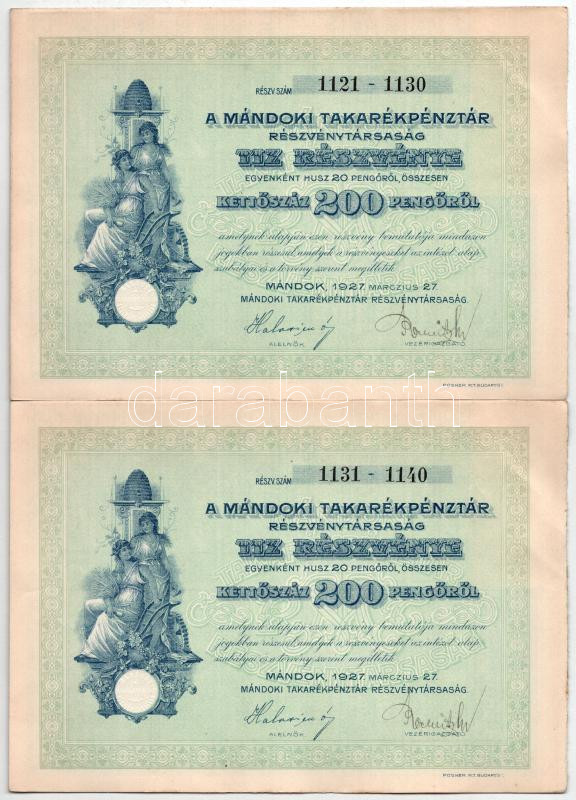 Leírás: Mándok 1927. "Mándoki Takarékpénztár Részvénytársaság" tíz részvénye egyenként 20P-ről, összesen 200P-ről (2x) sorszámkövetők T:XF