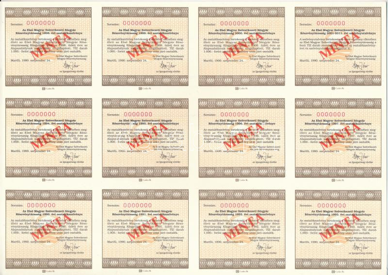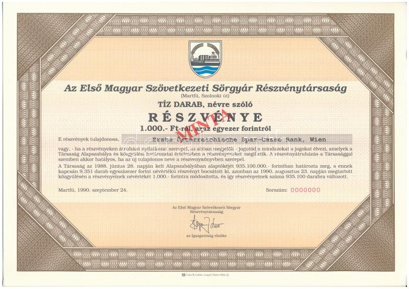 Leírás: Martfű 1990. "Első Magyar Szövetkezeti Sörgyár Részvénytársaság" 10db névre szóló részvénye 1000Ft értékben, "MINTA" felülbélyegzéssel, "0000000" sorszámmal, szelvényekkel T:AU
