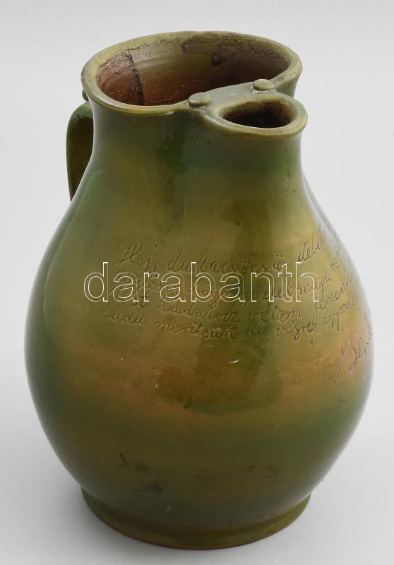 Leírás: Antik zöld mázas kerámia boros kancsó, pajzán felirattal, kis kopással, m: 23 cm