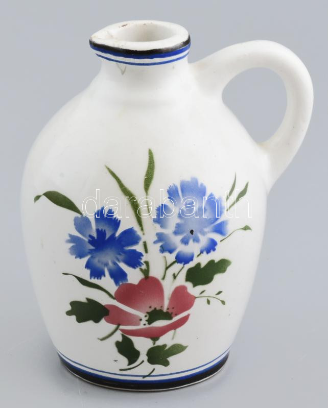 Leírás: Gránit virágmintás kiöntő, kancsó. Részben kézzel festett, jelzett, kis mázrepedésekkel, m: 13 cm