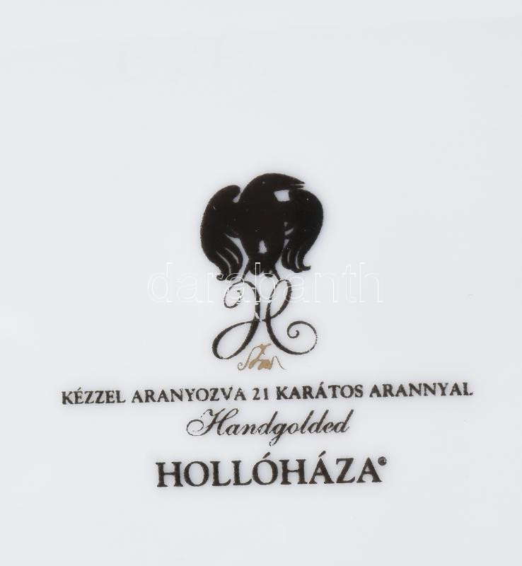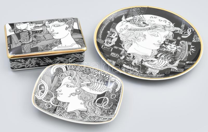 3 db Hollóházi porcelán (tányér, bonbonier, tálka), Szász Endre által tervezett mintával. (Kézzel aranyozva, 21 karátos arannyal). Matricás, jelzett, minimális kopásnyomokkal.
