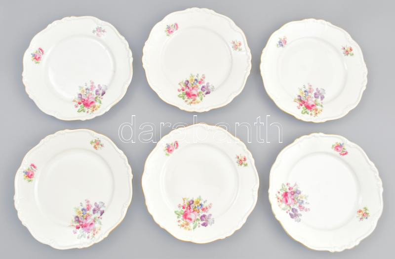 Leírás: 6 db Edelstein Bavaria Maria-Theresia porcelán süteményes tányér, virágmintával, aranyszínű peremmel. Matricás, jelzett, hibátlan, d: 19,5 cm