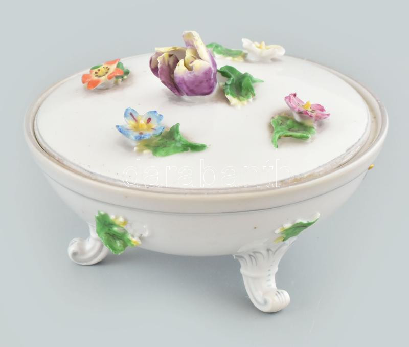 Leírás: Dresden porcelán bonbonier virág plasztikákkal, sérülésekkel, jelzéssel, d: 13 cm