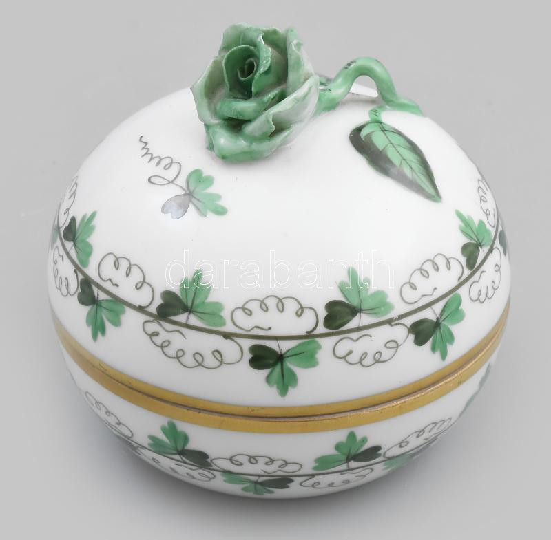 Leírás: Herendi petrezselyemmintás porcelán rózsás bonbonier, kézzel festett, jelzett, kis lepattanásokkal, d: 7,5 cm