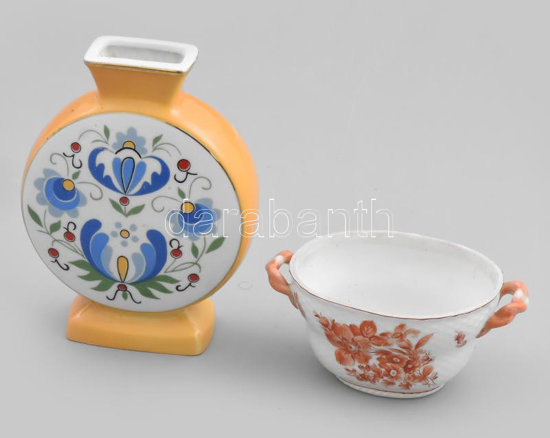 Leírás: Herendi porcelán bonbonier, tető nélkül, kézzel festett, jelzett, kopásnyomokkal + Virágmintás lengyel váza, jelzett, matricás, kopásnyomokkal