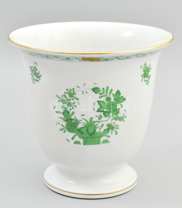 Leírás: Herendi zöld Apponyi mintás kaspó, jelzett, restaurált, repedt, m: 17,5 cm