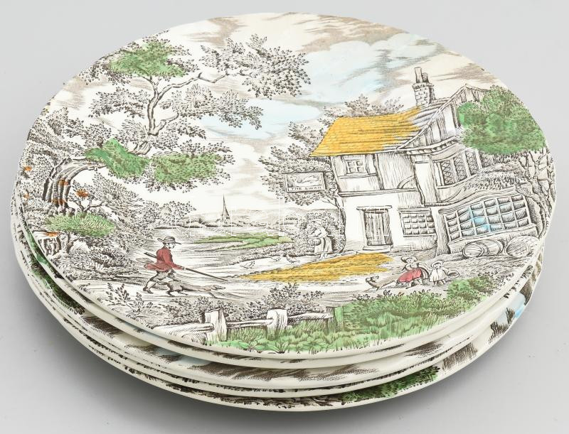 Leírás: Myott, The Hunter, részben kézzel festett angol nagytányér szett. 6 db. Jelzett, kis kopottsággal, d: 25 cm