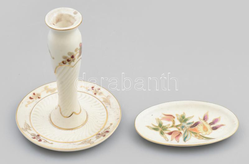 Leírás: Zsolnay porcelán gyertyatartó és kis tálka, kézzel festett, jelzett, kis kopásnyomokkal, gyertyatartó viaszmaradványokkal, m: 14 cm