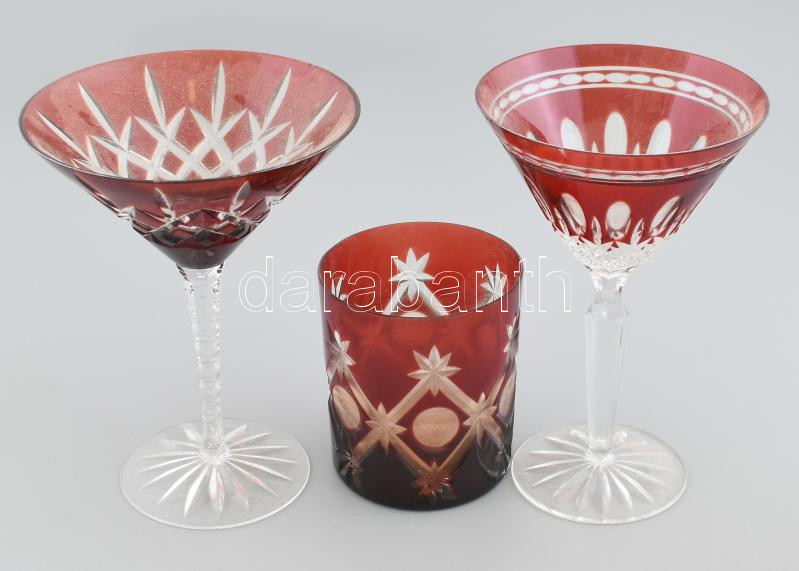 Leírás: 3 kristály kínáló. Két serleg (kis lepattanásokkal) m: 18 cm + kínáló tálka 10 cm