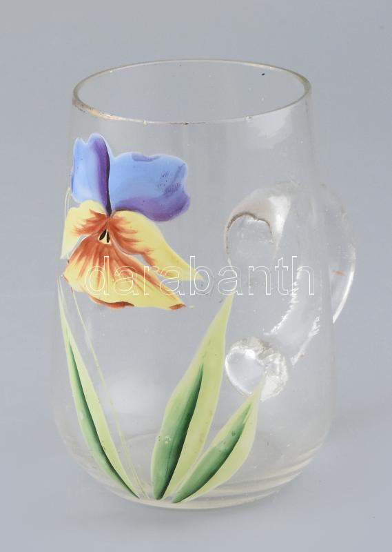 Leírás: Antik üveg emlékpohár, kézzel festett virágmintával, korának megfelelő állapotban, m: 10 cm
