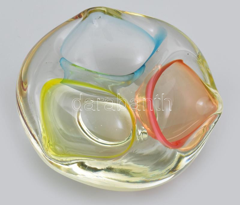 Leírás: Cseh színezett üveg háromosztatú kínáló, jelzés nélkül, hibátlan, d: 15 cm