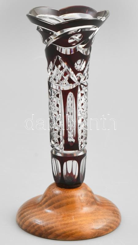 Leírás: Csiszolt vörös üvegváza, fa talpban, minimális kopottsággal, jelzés nélkül, m: 19 cm