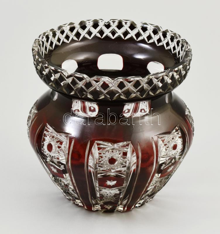 Leírás: Extrém gazdag csiszolással díszített csiszolt bordó kristályüveg váza, jelzés nélkül, kopással, m: 13,5 cm