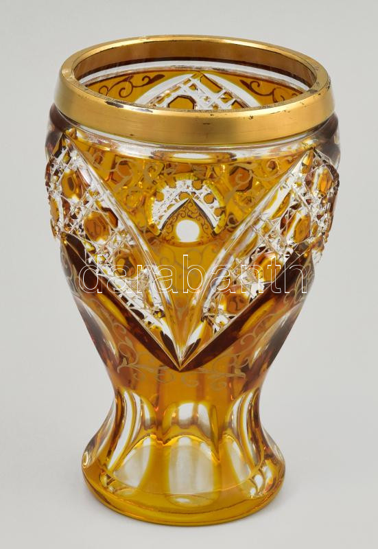 Leírás: Extrém gazdagon csiszolt mustárszínű kristály üvegváza, aranyozott díszítéssel, jelzés nélkül, kis kopással, m: 13 cm