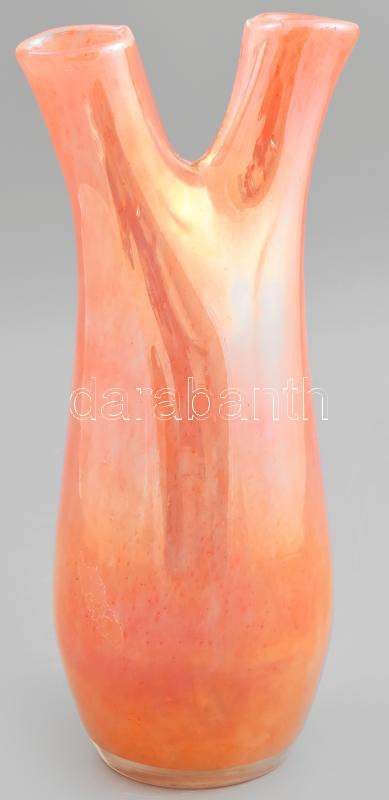 Leírás: Francia anyagában színezett, irizáló felületű kétágú üvegváza, jelzés nélkül, hibátlan, m: 29 cm