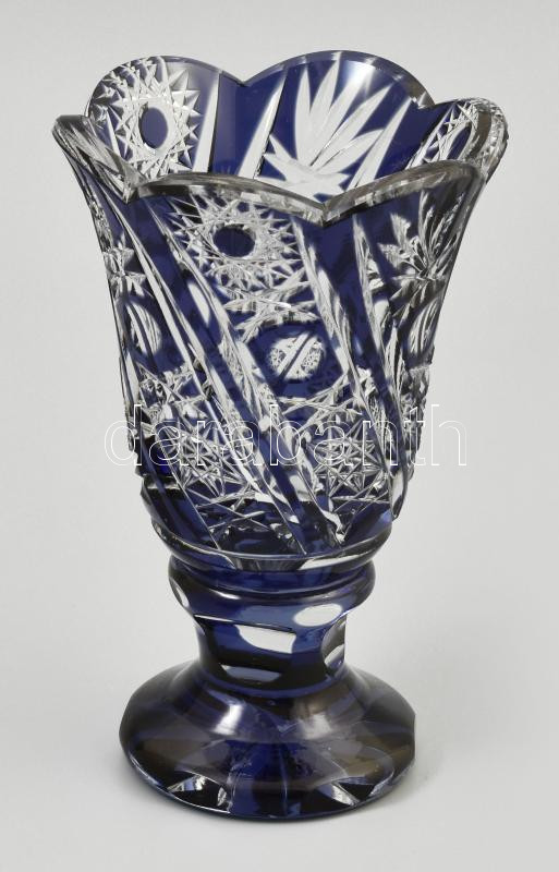 Leírás: Gazdagon csiszolt kék üvegkehely váza, jelzés nélkül, minimális kopottsággal, m: 14 cm