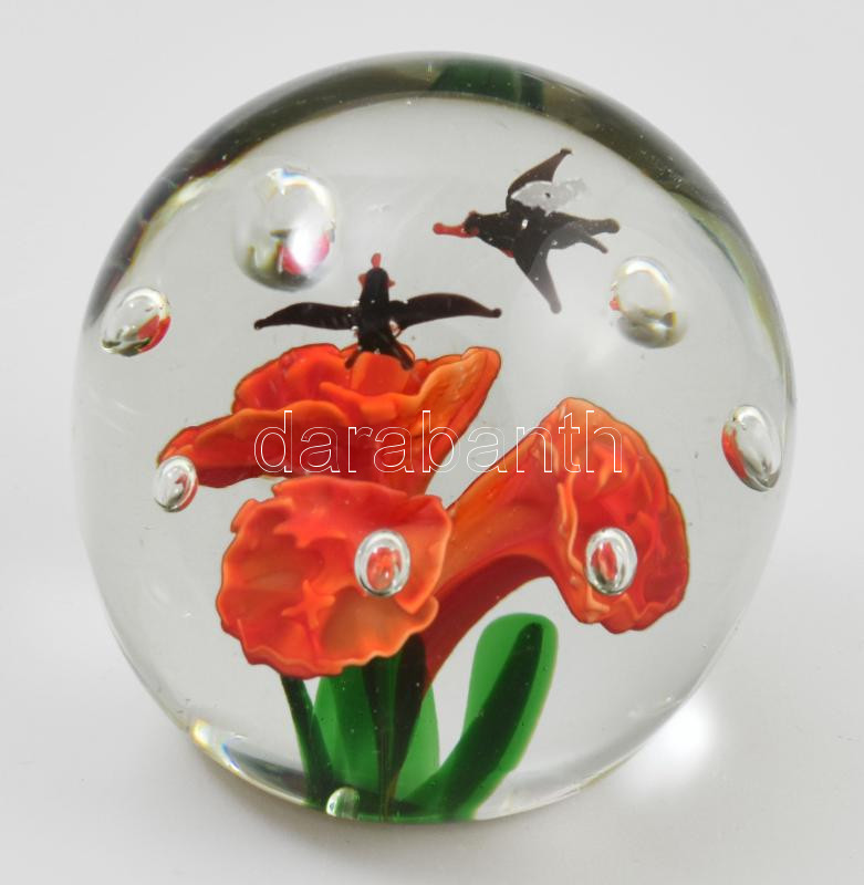 Leírás: Joska Design üveg levélnehezék, virágra szálló kolibrik figurális tartalommal, címkével jelzett, hibátlan, m: 9 cm