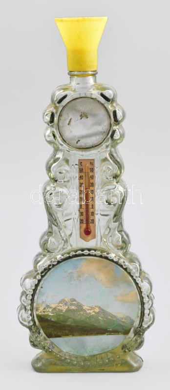 Leírás: Retro tükrös, hőmérős, nyomatképes parfümös díszüveg. Kopással, jelzéssel, m: 27 cm