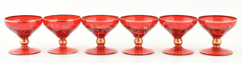 Leírás: Tűzpiros aranyozott, virágmotívumos likőröspohár, 6 dn, hibátlan, m: 6,5 cm