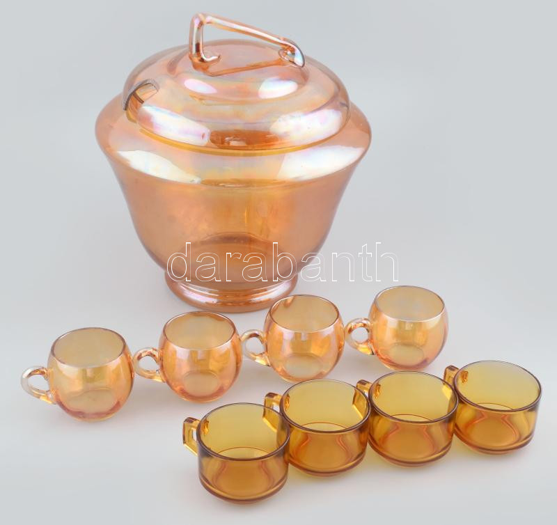 Leírás: Üveg bólés készlet 8 pohárral (két különböző fajta), festett, sérülésekkel, m: 29 cm