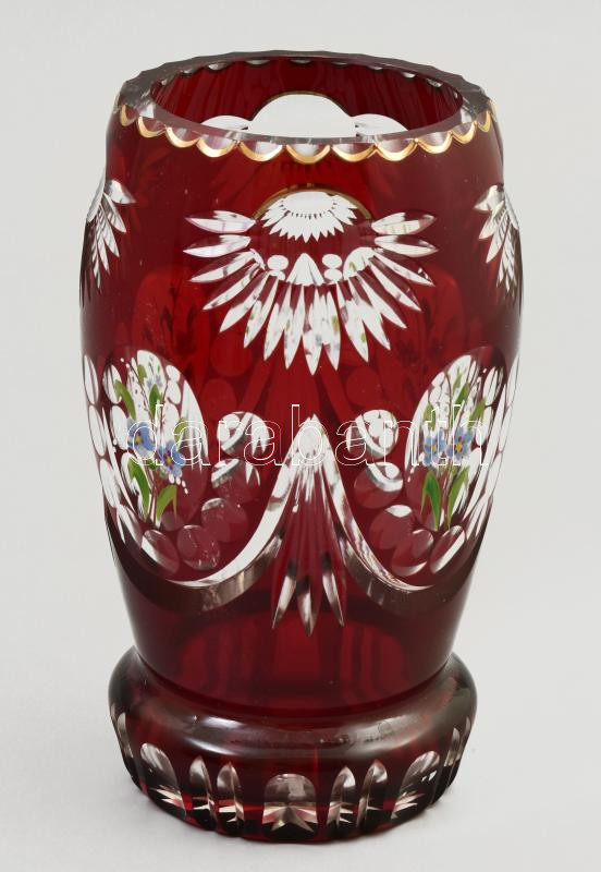 Virágmintával festett csiszolt bordó üvegváza, jelzés nélkül, minimáli... https://www.darabanth.com/hu/444-Gyorsarveres/444.0/Porcelan-keramia-uveg/Uvegtargyak~500009/Viragmintaval-festett-csiszolt-bordo-uvegvaza-jelzes-nelkul-minimalis-kopassal-m-16-cm~II2911769