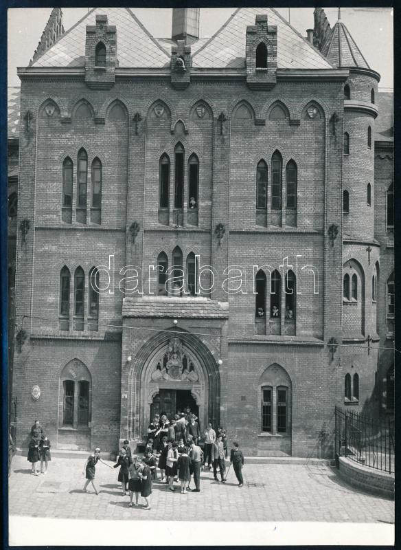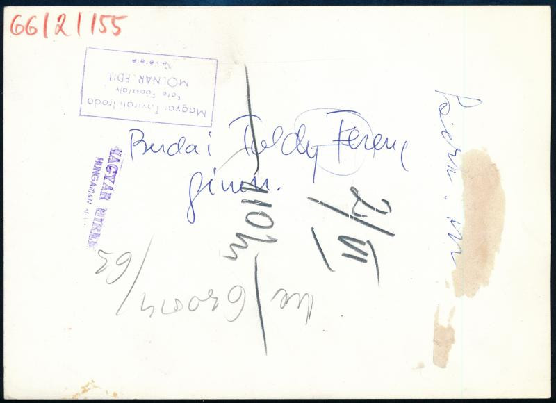 Leírás: 1966 Bp., I. ker., Toldy Ferenc Gimnázium, sajtófotó, a hátoldalon feliratozott, pecséttel jelzett, 18x13 cm
