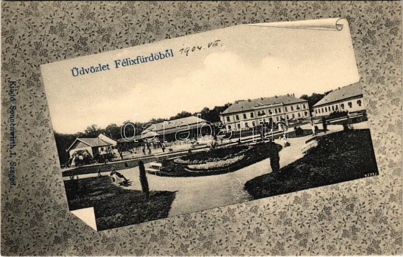 Leírás: Félixfürdő, Baile Felix; fürdő park. Sonnenwirth L. kiadása, szecessziós montázs / spa park. Art Nouveau montage