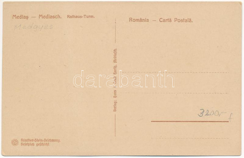 Medgyes, Mediasch, Medias; Rathaus Turm. Künstler Stein Zeichnung, Ver... https://www.darabanth.com/hu/445-Gyorsarveres/445.0/Kepeslapok/Erdely~2000006/Medgyes-Mediasch-Medias-Rathaus-Turm-Kunstler-Stein-Zeichnung-Verlag-Hans-Ernst-Harth-Var~II2943230