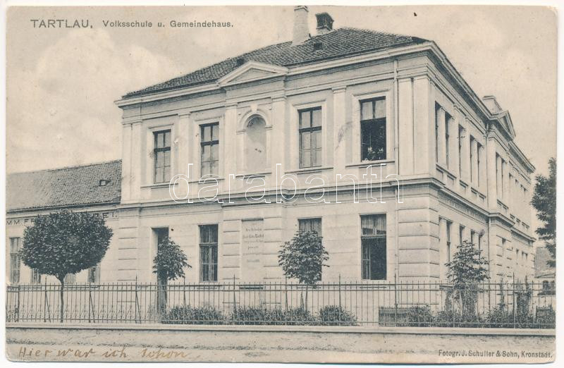 Leírás: Prázsmár, Tartlau, Presmer, Prejmer; Volksschule und Gemeindehaus / iskola és városház / school and town hall (EK)