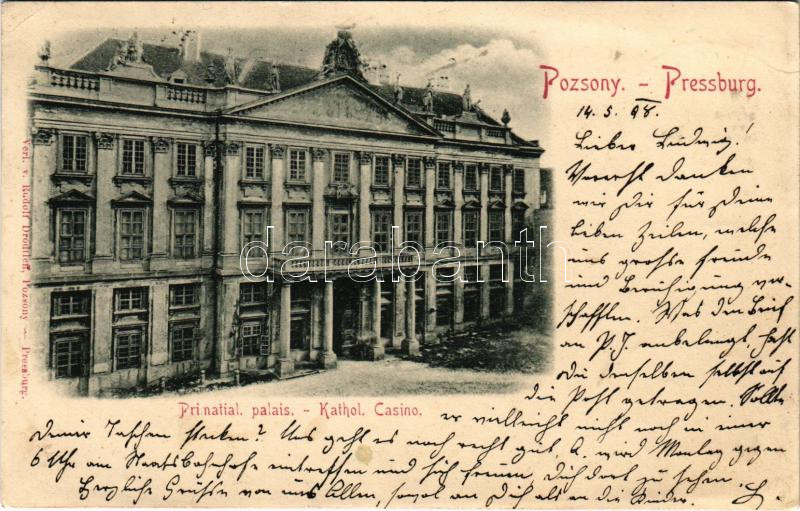 1898 (Vorläufer) Pozsony, Pressburg, Bratislava; Primatial Palais, Kat... https://www.darabanth.com/hu/445-Gyorsarveres/445.0/Kepeslapok/Felvidek~2000007/1898-Vorlaufer-Pozsony-Pressburg-Bratislava-Primatial-Palais-Kathol-Casino-Primasi-palot~II2941555
