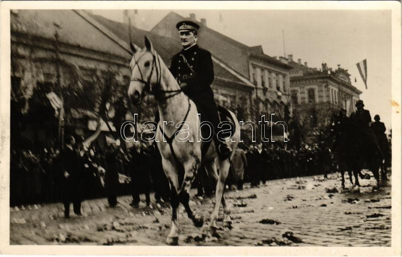1938 Kassa, Kosice; Vitéz nagybányai Horthy Miklós kormányzó diadalmas bevonulása a vissza szerzett területekre / entry of the Hungarian troops, Horthy on white horse, shop
