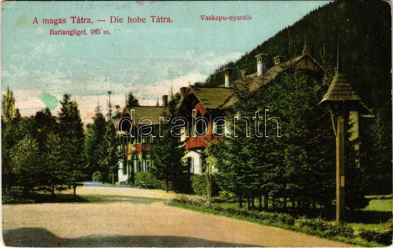 Leírás: Barlangliget, Höhlenhain, Tatranská Kotlina (Tátra, Magas Tátra, Vysoké Tatry); Vaskapu nyaraló. Divald Károly műintézete 1997-1908. / villa (EK)