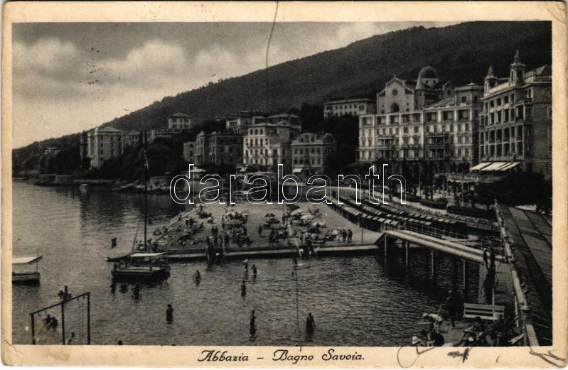 1936 Abbazia, Opatija; Bagno Savoia / beach, bath (EK) https://www.darabanth.com/hu/445-Gyorsarveres/445.0/Kepeslapok/Horvatorszag~2000009/1936-Abbazia-Opatija-Bagno-Savoia-beach-bath-EK~II2944273