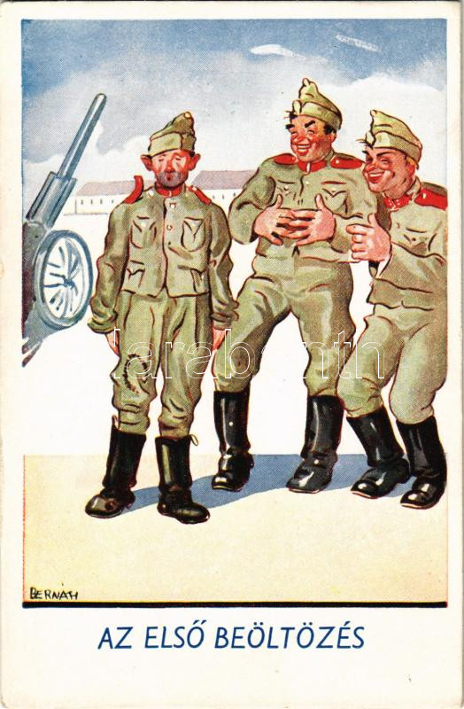 Az első beöltözés / Hungarian military art postcard, humour s: Bernáth https://www.darabanth.com/hu/445-Gyorsarveres/445.0/Kepeslapok/Katonai~2000031/Az-elso-beoltozes-Hungarian-military-art-postcard-humour-s-Bernath~II2944049