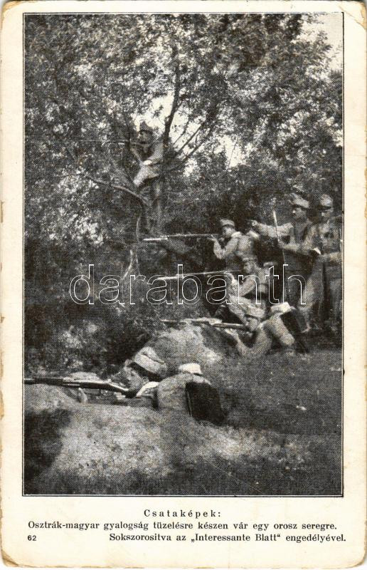 Csataképek 62. Osztrák-magyar gyalogság tüzelésre készen vár egy oroszseregre. Sokszorosítva a Interessante Blatt engedélyével / WWI Austro-Hungarian K.u.K. military art postcard, waiting for the Russian army. Wiener Rotophot (EK)