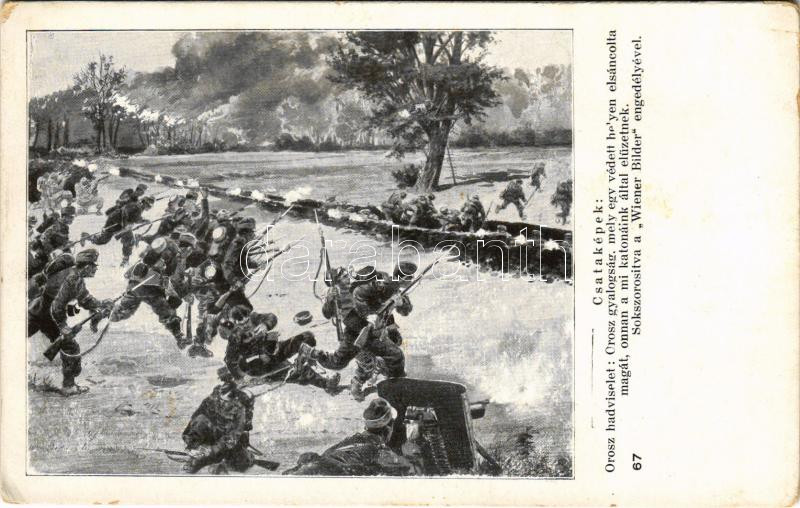 Csataképek 67. Orosz hadviselet, orosz gyalogság, mely egy védett helyen elsáncolta magát, onnan a mi katonáink által elűzetnek. Sokszorosítva a Wiener Bild engedélyével / WWI Austro-Hungarian K.u.K. military art postcard, Russian warfare. Wiener Rotophot (fl)