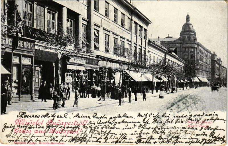Leírás: 1899 (Vorläufer) Budapest V. Károly körút, Heller Móric üzlete, Adler könyvesboltja, fodrász. Kiadja Schmidt Edgar (EK)