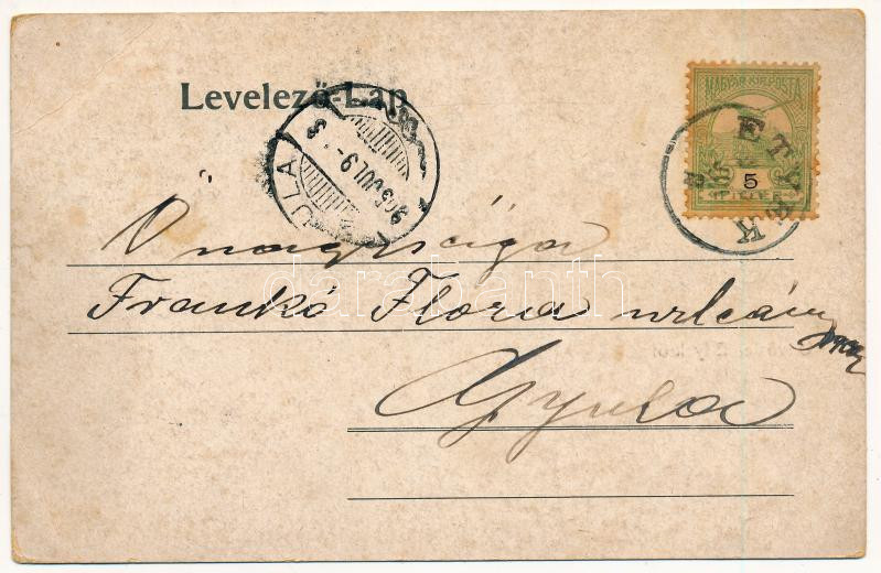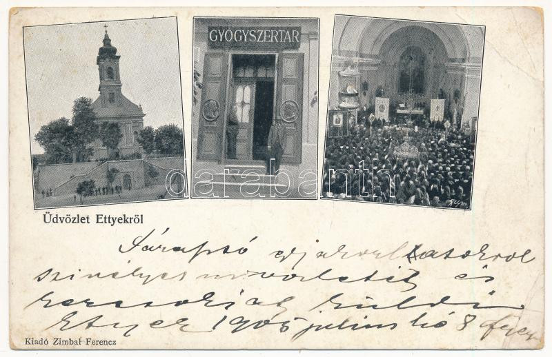 Leírás: 1905 Etyek, Ettyek; Római katolikus templom és belseje, szentmise, gyógyszertár. Zimbal Ferenc kiadása (EB)