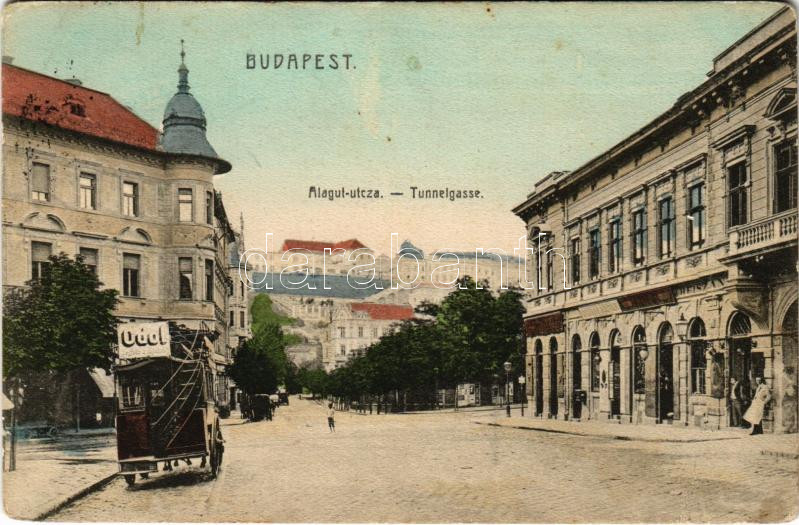 Leírás: 1910 Budapest I. Alagút utca, omnibusz Odol reklámmal, üzletek, gyógyszertár. S.L.B. No. 120. (kopott sarkak / worn corners)