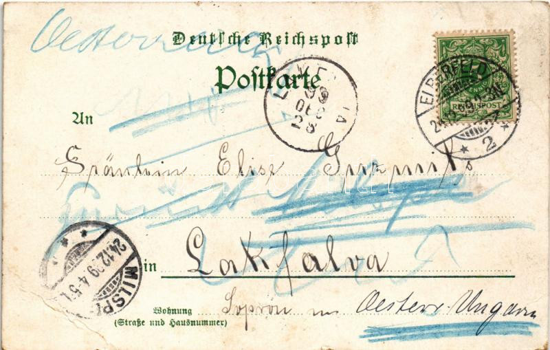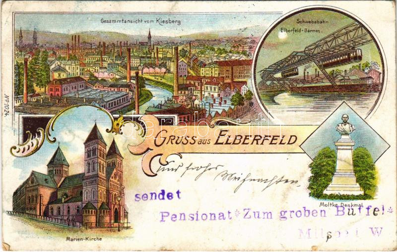 Leírás: 1899 (Vorläufer) Elberfeld, Gesammtansicht vom Kiesberg, Schwebebahn Elberfeld-Barmen, Marien-Kirche, Moltke Denkmal / general view, church, suspension railway, monument. Art Nouveau, floral, litho (EB)