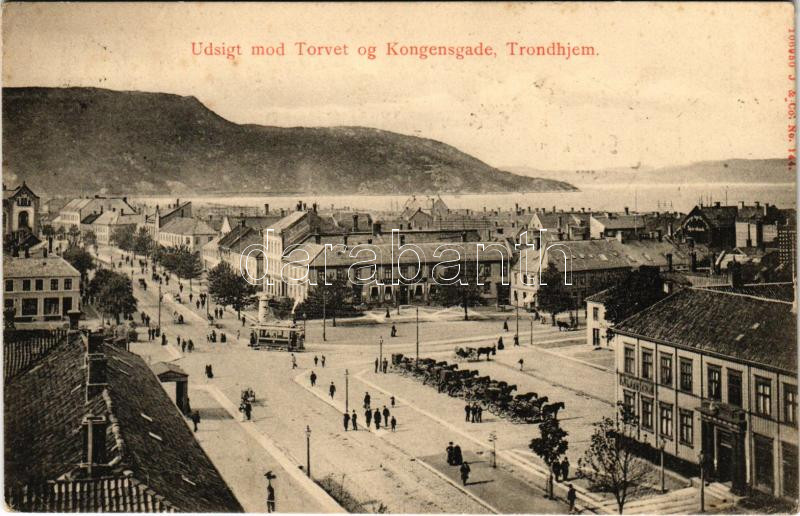1907 Trondheim, Trondhjem; Udsigt mod Torvet og Kongensgade / square, ... https://www.darabanth.com/hu/445-Gyorsarveres/445.0/Kepeslapok/Norvegia~2000092/1907-Trondheim-Trondhjem-Udsigt-mod-Torvet-og-Kongensgade-square-tram-pharmacy-EK~II2936121