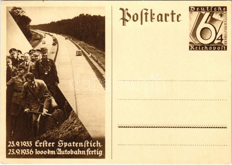 1933 Erster Spatenstich - 1936 1000 km Autobahn fertig / 1933 First Groundbreaking - 1936 1000 km highway completed. Adolf Hitler, NSDAP German Nazi Party propaganda. 6+4 Ga.
